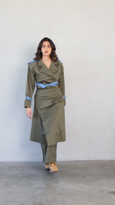 Confectionnée en drill de coton épais avec des détails en jean véritable délavé sur la ceinture et les pans, elle combine l’allure workwear à une touche couture.