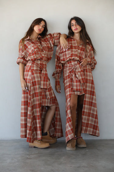 Découvre l'ensemble Madison Rouge et Beige, l’incarnation d’une élégance oversize dans un tissu tartan chaud aux tons rouge et beige profonds
