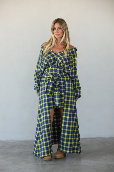 L’ensemble Madison Bleu et jaune réinvente l’élégance oversize avec un tissu tartan chaud et structuré. Conçu pour offrir à la fois confort et audace, il associe une chemise oversize à une jupe courte boutonnée.